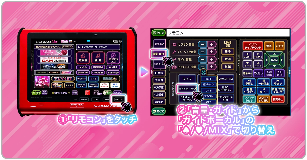 ③「ガイドボーカル」から「♠」「♥」「MIX」を選択し、デュエットを切り替え