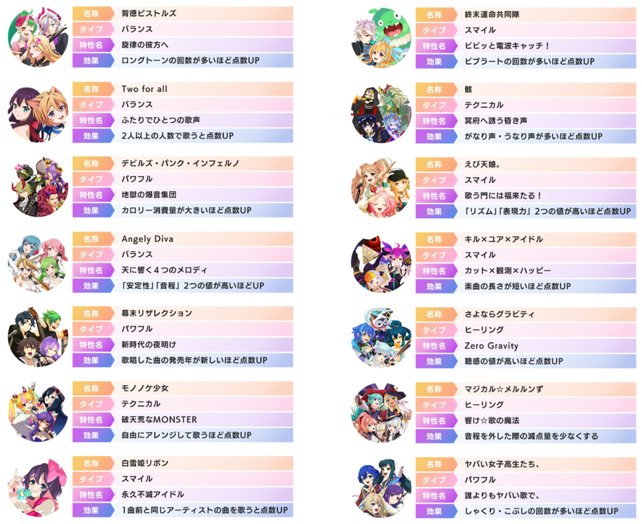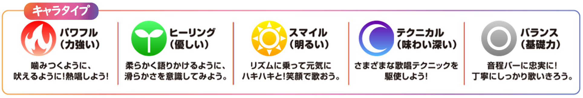 各ユニットには「パワフル」「ヒーリング」「スマイル」「テクニカル」「バランス」の5種類のタイプがあり、タイプに合わせた歌い方をすることで、曲中のキャラゲージが溜まりやすくなります。