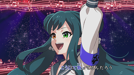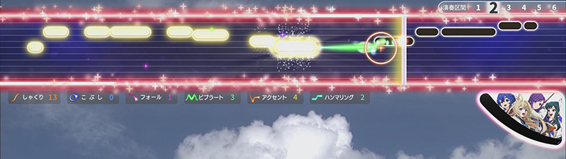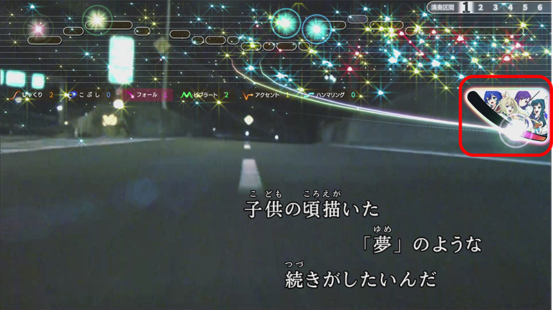 上手く歌唱するとキャラゲージが溜まっていき、ゲージがMAXまで溜まるとキャラクターのカットイン演出とともにアクションが発動!