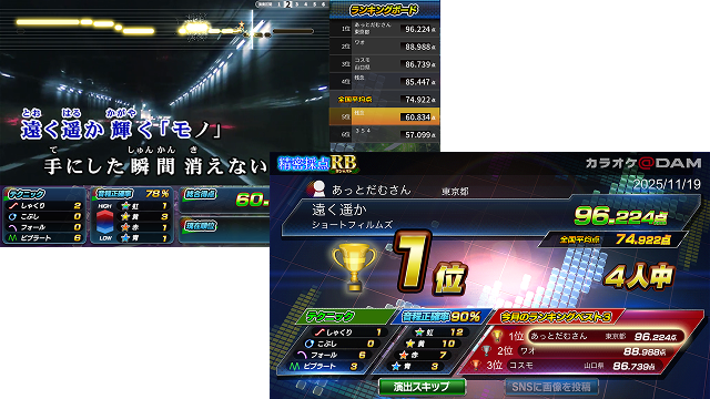 さらに採点画面では技法カウントに加えて音程正解率もリアルタイムに変動するので、現在の採点状況が細かく分かります。