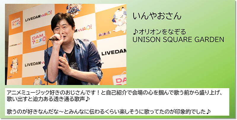 —いんやおさん:アニメミュージックが好きで夢のステージに立ってみたいな〜と思ってアニメ好きおじさんの代表として応募しました。