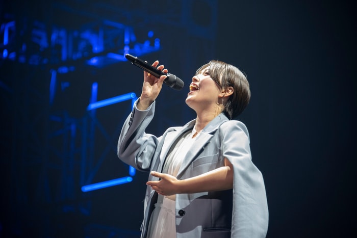 せっかく青のセットアップなので、ステージで映えるようにコーディネートしたくて。ステージ上でくるっと回転したかったので(笑)、白いチュールがふわっと広がるワンピースを合わせて、色を主役にしたコーデにしてみました。