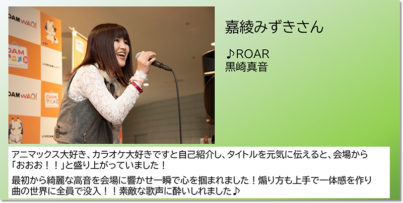 —嘉綾みずきさん:アニメミュージックが大好きで、オーディションを見つけ、応募してそれから毎日カラオケ行って練習してました!
