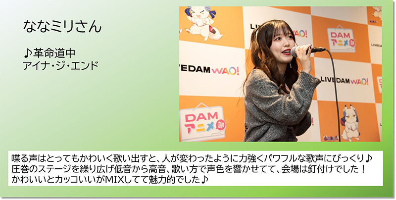 —ななミリさん:あまり人前で歌ったことなくて、カラオケも1人で行くタイプなので、歌う前は大丈夫かな?と心配してたんですがすごい会場の方々が温かくて、コール&レスポンスもしてくれて、楽しく歌えました!