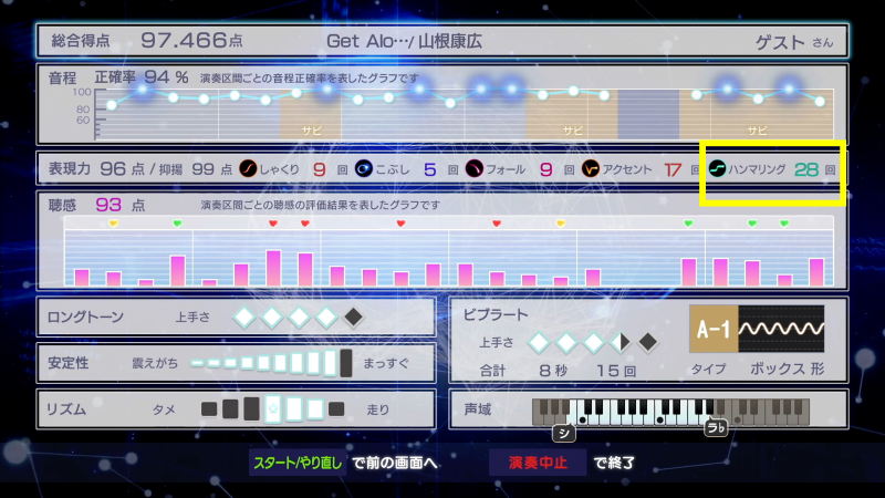精密採点の歌唱後の結果画面に表示される技法について